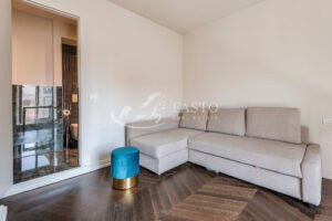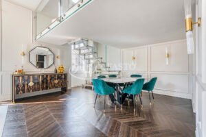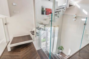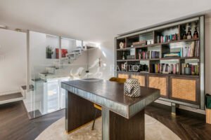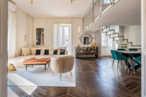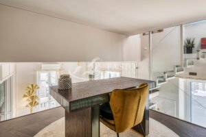 Il soggiorno, ampio e luminoso, vanta un'esposizione angolare con due balconi che regalano una vista incantevole su Porta Romana. La sala da pranzo è spaziosa e si collega a una cucina su misura, completa di un locale lavanderia finestrato. Una scala di design in cristallo conduce al piano superiore, dove si trova uno studio con vista sull'intera zona giorno, ideale per lavorare in un ambiente silenzioso ed ispiratore.