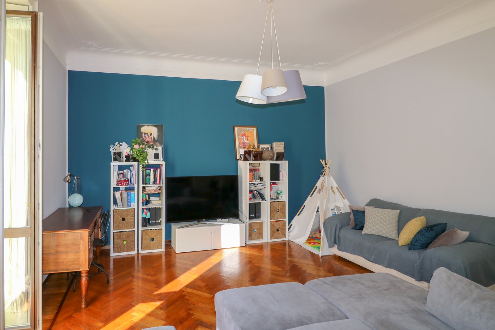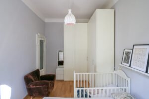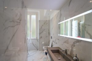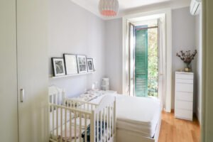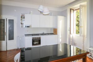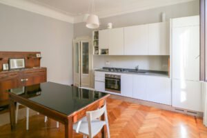 L’immobile è composto da ingresso su ampio disimpegno, il quale apre sulla destra ad un ampio soggiorno doppio con sala da pranzo e cucina a vista, nella zona notte troviamo rispettivamente la camera matrimoniale con ampio balcone ed affaccio interno, zona di servizio lavanderia/ bagno ospiti, infine bagno padronale.